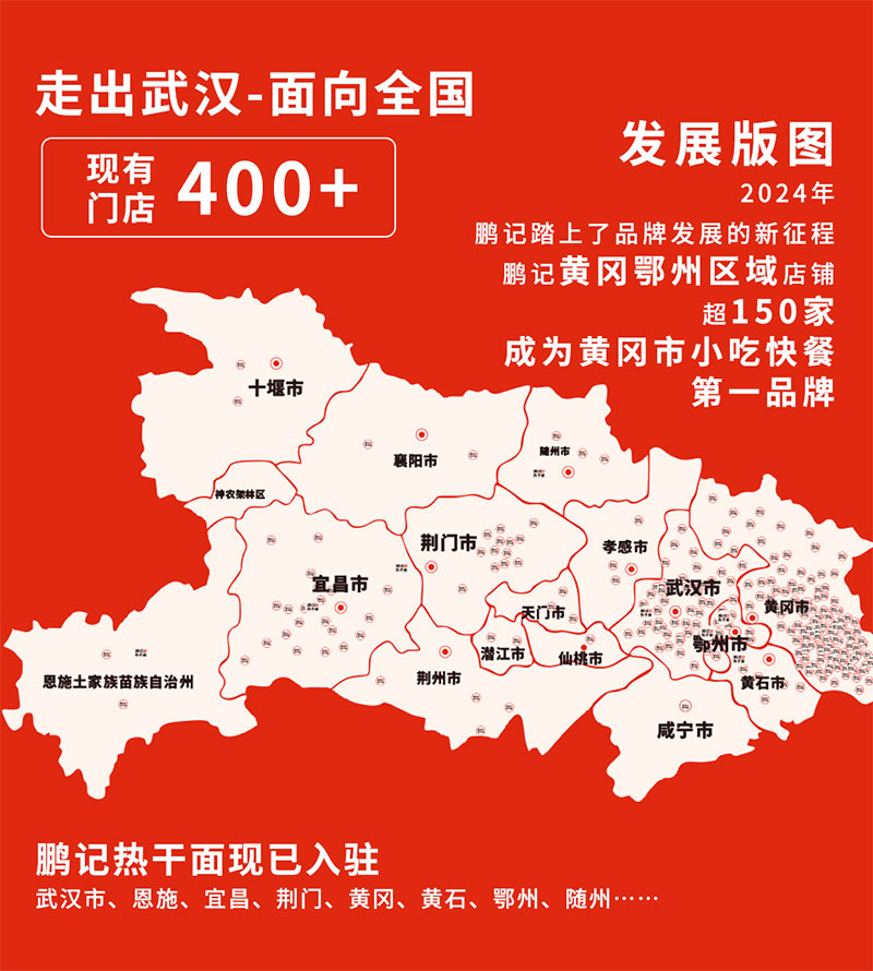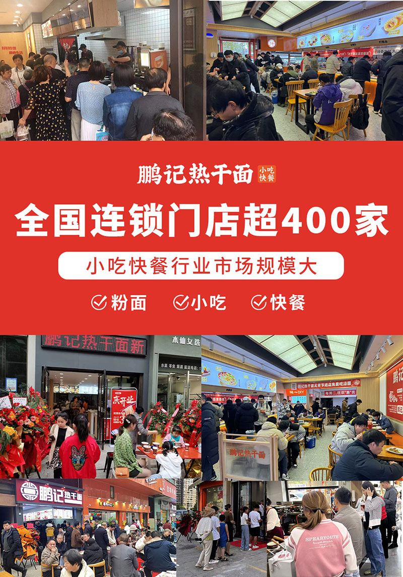 鹏记热干面,作为一家武汉本土餐饮企业,自1992年首家店铺发展至今已转变成企业化运作的成熟品牌,秉承着“弘扬中华传统美食,用心做好每一碗面”的理念,在湖北向下扎根,经营模式从传统面馆转化为小吃快餐复合型店,主营热干面、鲜肉生煎包、豆皮、糊米酒、馄饨等数十种武汉传统小吃,搭配小炒、盖浇饭等特色中餐,目前全国门店已突破400+。